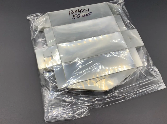 Збірні коробки прозорого кольору виконані з полімерної плівки (пластику). Призначені для пакування продукції на продаж, подарунків і подарункових наборів. Прості в збірці, оснащені висічками для стійкої фіксації сторін виробу. Часто використовуються для ялинкових іграшок, візиток, свічкової, сувенірної продукції, парфумерії, косметики, і пластикових виробів широкого вжитку.